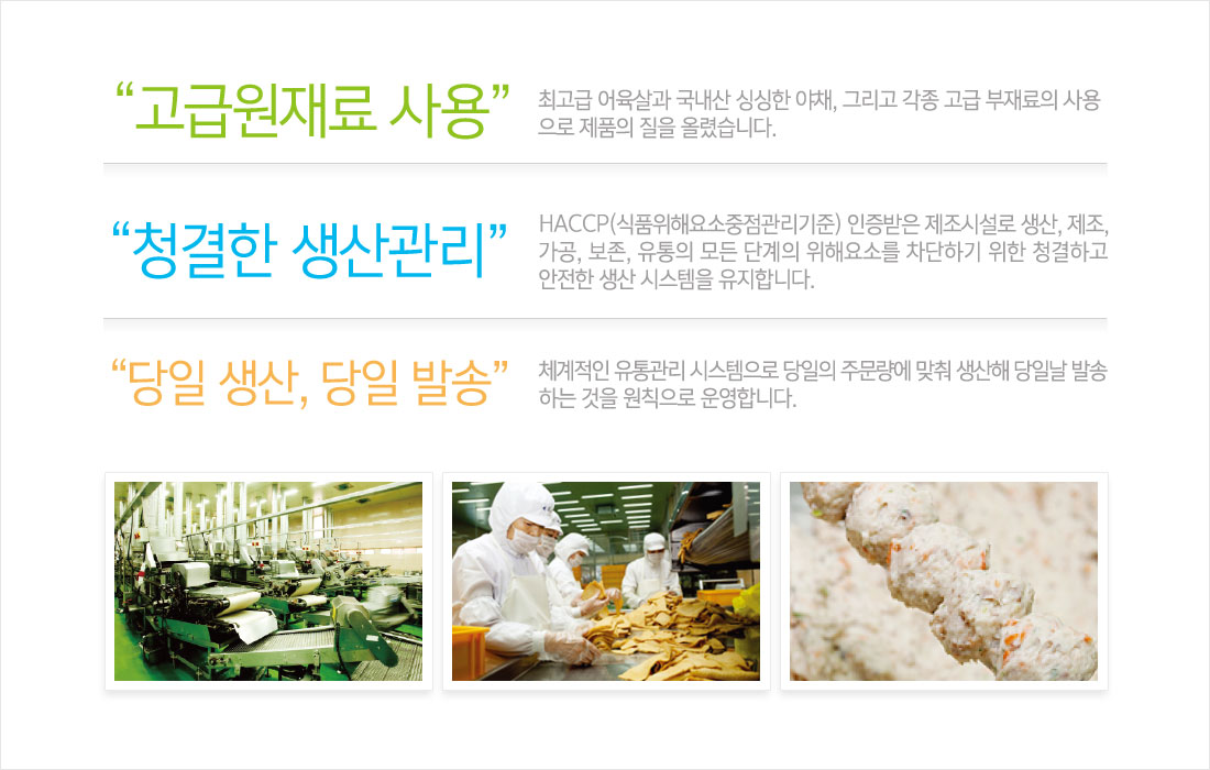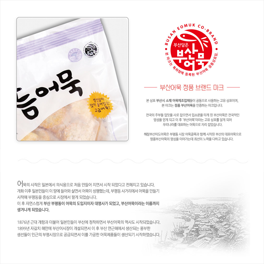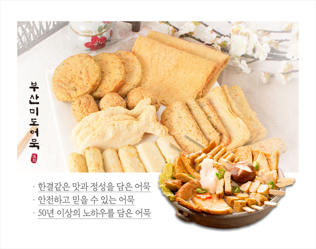 50년이상 언제나 한결같은 마음으로 부산을 대표하는 어묵을 만들어 왔으며, 앞으로 그마음 변치않고 깨끗하고 맛있는 어묵을 만들겠습니다.