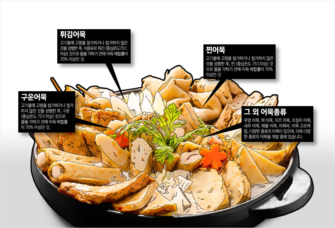 60여가지 이상의 다양한 어묵들이 있으며, 대표적으로 튀김어묵, 구운어묵, 찐어묵 등이 있습니다..